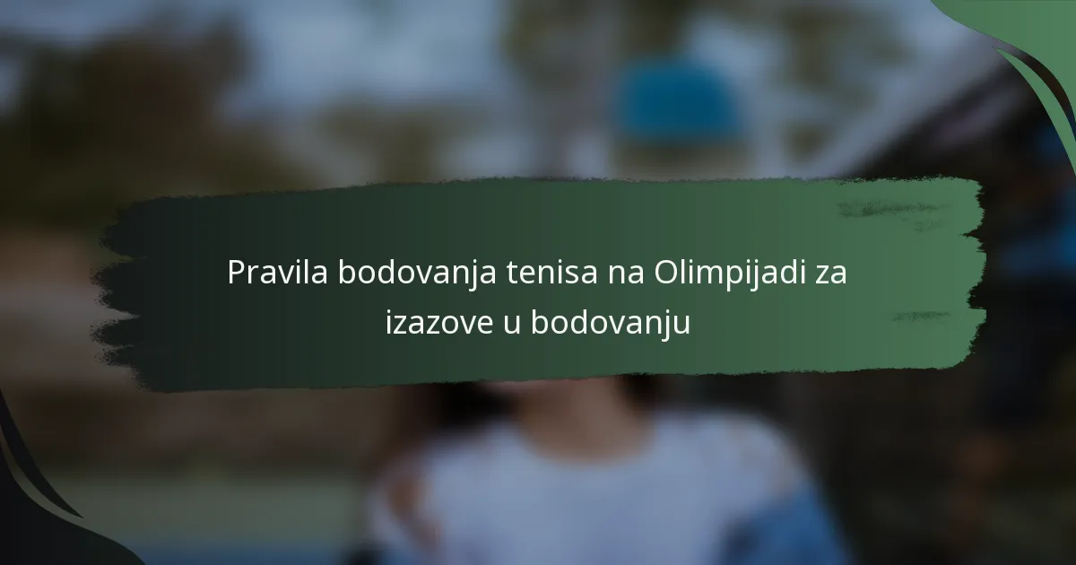 Pravila bodovanja u olimpijskom tenisu strukturirana su oko igara, setova i mečeva, odražavajući tradicionalni tenis dok uključuju jedinstvene elemente. Razumijevanje ovih pravila je ključno, posebno tijekom izazova u bodovanju, gdje igrači mogu osporiti odluke o linijama koristeći naprednu tehnologiju poput Hawk-Eye-a za točno donošenje odluka.